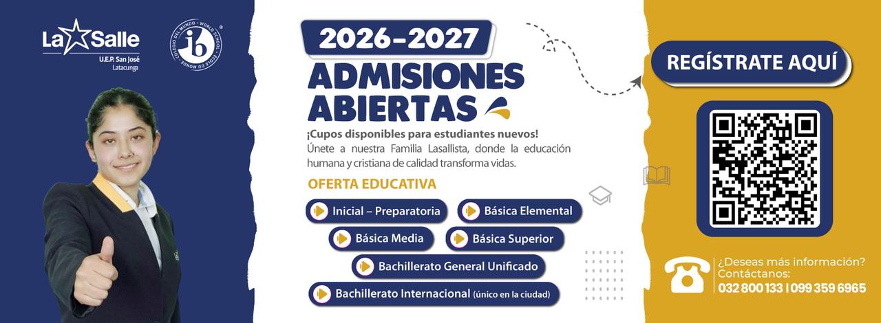 Por más de 150 años continuamos haciendo historia en el caminar de la vida Institucional de La Salle en Latacunga; En esta ocasión queremos presentarles el prospecto de admisión y selección para el año lectivo 2025-2026 en todos los sub niveles, fundamentada en los valores del evangelio y De La Salle como son FE, FRATERNIDAD, SERVICIO, JUSTICIA Y COMPROMISO.